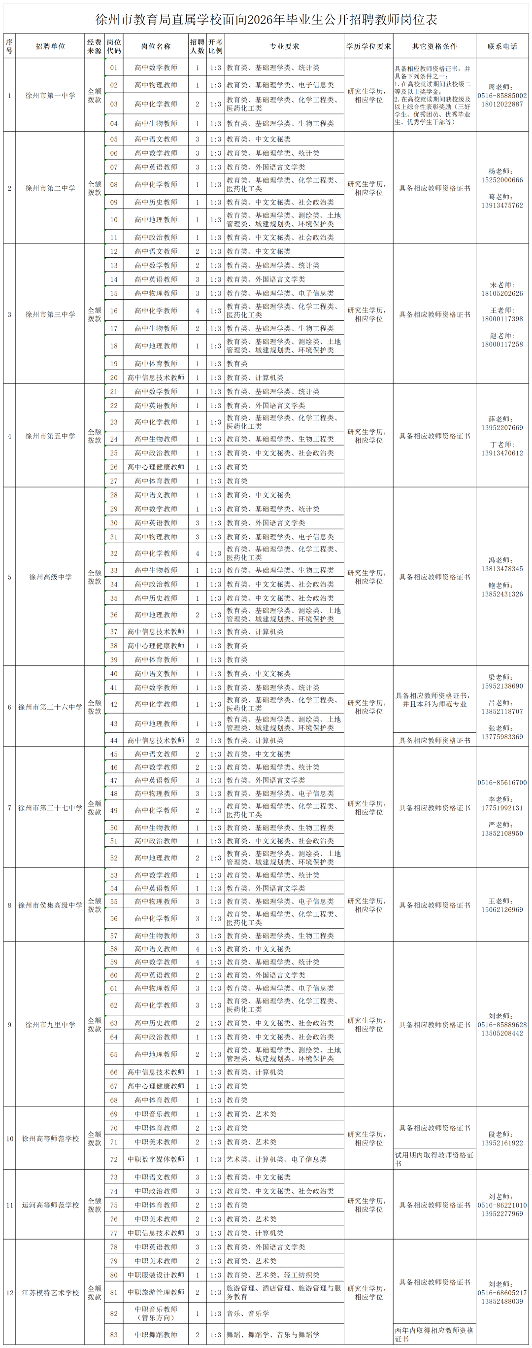 1.徐州市教育局直属学校面向2026年毕业生公开招聘教师岗位表