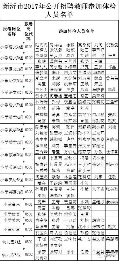 详见《新沂市2017年公开招聘教师参加体检人员名单》